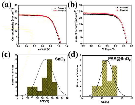 Current density−voltage (J−V) curves of devices based on (a) pristine SnO2 and (b) PAA@SnO2 with PAA concentration of 1.0 mg/mL under reverse-forward scanning directions. The PCE distribution of the PSCs of (c) SnO2 and (d) PAA@SnO2.