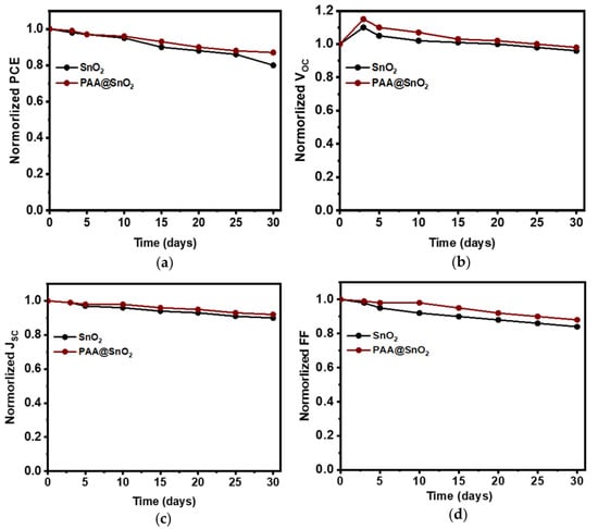 The long-term stability of PSCs with SnO2 and PAA@SnO2 was evaluated in a nitrogen environment without encapsulation. Figure 11 illustrates the shelf stability of PSCs with different ETLs over time. After 30 days of storage, the device using the PAA@SnO2 ETL retained 89% of its original power conversion efficiency (PCE), whereas the device with the SnO2 ETL experienced a 21% reduction in its initial PCE. This indicates that devices with the PAA@SnO2 ETL are more stable, likely due to improved contact between the PAA@SnO2 ETL and perovskite layer. The degradation of the charge carrier transport layer and perovskite layer is a well-known factor contributing to the instability of PSCs. The enhanced stability in the PAA@SnO2-based devices when compared to those with SnO2 can be attributed to the improved interaction between the ETL and the perovskite layer.