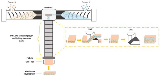 The multi-nano-layer co-extrusion process allows us to produce films composed of up to a few thousand individual layers within a single step process (Figure 1). These layers can be as thin as a few tens of nanometers for an overall film thickness of several tens of micrometers [18,24]. This technique relies on the use of multiplying elements that induce an alternation of two different polymer phases, A and B, chosen to be of the same nature or not. The thickness of the individual layers is calculated using the following equation: