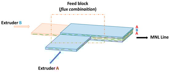 To manufacture MNL films, two single-screw extruders (E30E and E45E from Collin, featuring a 30 mm and 45 mm diameter, respectively, and a 25 L/D ratio for both) were connected by a co-extrusion feed block (Nordson), which combines polymer melting flux together within an A/B/A configuration. Indeed, the feed block consists of several channels. There is a central channel wherein extruder B is connected, and a lateral channel wherein extruder A is connected. The flow from extruder A is then divided into two to go on either side of the central flow, which is composed of polymer phase B. Thus, in this configuration, there is a three-layer flow (A-B-A) at the output of the feed block, which will then go through the MNL line (Figure 2). Two film architectures were produced: one with phase A using only LLDPE, and phase B with 5 wt% of MMT (C20A_5_5 blend) to verify the layer architecture; the other with both phase A and B equivalent, containing 5 wt% of MMT. The flow ratio of A/B phases was set at 50/50.