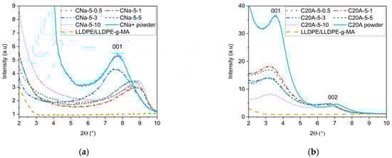 Figure 4a,b show the XRD patterns of all the compounds listed in Table 1 made with 5 wt% of CNa+ and C20A, respectively and the LLDPE/LLDPE-g-MA matrix alone. The matrix alone does not exhibit diffraction peaks below 10°, ensuring that the Bragg peaks observed in samples with montmorillonite belong to it. In both cases, the variations in the extrusion feed rate do not result in the disappearance of the MMT 001 or 002 Bragg peaks. In the case of the CNa+ MMT, the pristine powder shows a 001 Bragg peak at 2θ = 7.7° while most of the compounds exhibit a 001 Bragg peak at almost 9°. This shift to a larger angle suggests a reduction in the distance between the basal planes of 170 pm. We believe that this may be due to the removal of Na+ ion during the process, as this ion has a diameter of about 200 pm [32].