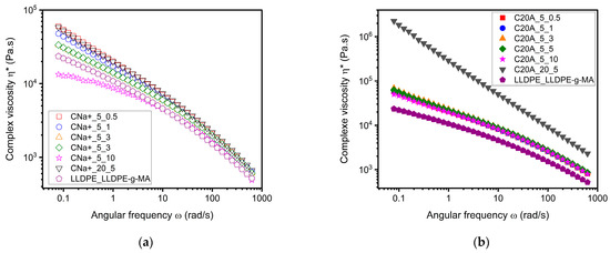 Figure 5a,b display the complex viscosity of compounds with both MMTs, as well as that of the pristine polymer. They reveal several noticeable features. First, one can note that the addition of fillers increases the complex viscosity of the compounds compared to that of the polymer matrix alone over the entire frequency range. There is also an increase in the complex viscosity when the filler concentration is increased to 20 wt%, especially for the C20A MMT. This phenomenon is quite intuitive, as the MMT is an inorganic material with much higher mechanical properties than those of LLDPE. More interestingly, Figure 5a shows some differences in viscosity at low frequencies for the different CNa+ compounds. The related melt yield stresses, σ0, calculated from Equation (2), are indicated in Table 5 and Table 6. Their values reduce significantly with increasing feed rates. According to Vergnes et al. [23], this suggests that the state of exfoliation of CNa+ decreases with increasing feed rate. This is because with a high feed rate, the residence time is reduced, giving the MMT less time to be exfoliated along the screws.