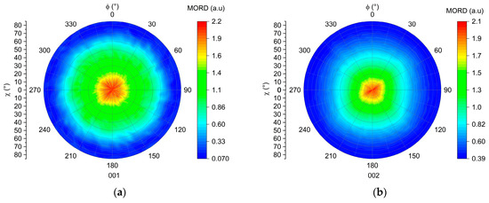 XRD texture analysis were carried out to plot the pole figures of the (001) for the CNa+ MMT and (002) for the C20A MMT lattice planes [37,38]. The results, shown in Figure 8, gather the MORD intensities of the 001 Bragg peak investigated as a function of the χ and Φ positions. The χ angle corresponds to the inclination angle of the sample during the measurement, and Φ encompasses all directions around the film. Thus, we are able to measure the intensity diffracted from the lattice plane, under investigation for each χ and Φ position [39].