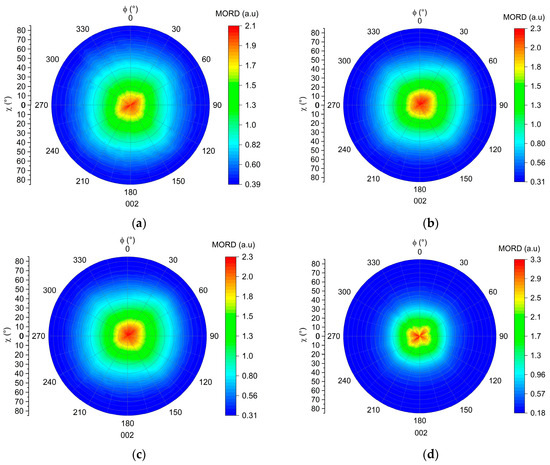 Pole figures of the (002) lattice plane of the MMT nano-sheets embedded in films prepared by the thermo-compression process: (a) C20A-5-5 compound; (b) C20A-10-5 compound; (c) C20A-15-5 compound; (d) C20A-20-5 compound.