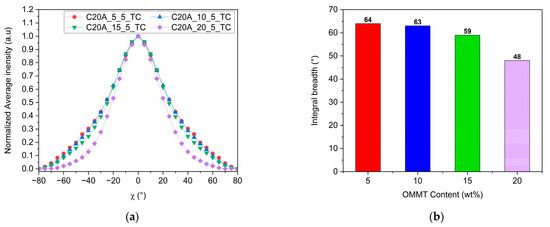 According to Equation (3), the sharper the peak, the smaller the dispersion around 0° along χ, and the smaller the integral breadth. At a concentration of 5 and 10 wt% of MMT, the orientation is similar, with integral breadth values of 64 and 63°, respectively. With the increase in the concentration up to 15 and 20 wt%, the integral breadth decreases to 59° and 48°, respectively.