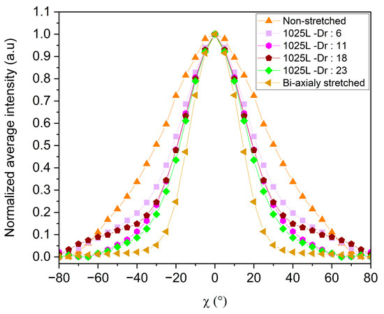 Average intensity over Φ versus χ from 002 MMT pole figures of each sample. Each film has 1025 layers, and the draw ratio varies from 6 to 23.