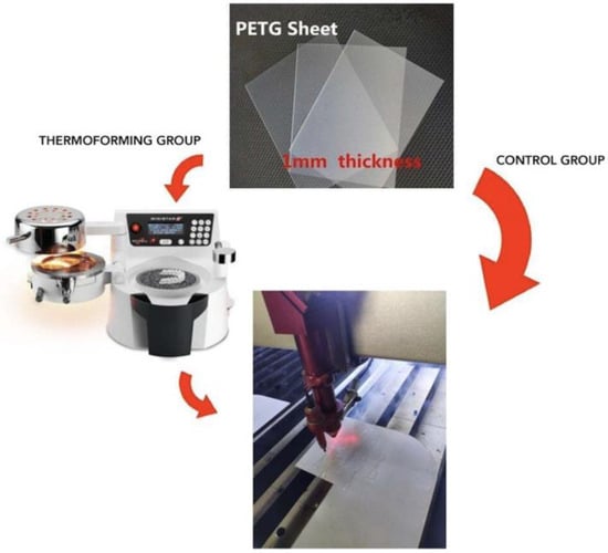 At baseline, 60 PET-G sheets (Erkodur, Erkodent Erich Kopp GmbH, Pfalzgrafenweiler, Germany) were selected and randomly assigned by a third person (not involved in the research) to two different groups: 30 sheets (thermoforming group—TG) underwent the thermoforming process, while 30 sheets (control group—CG) were analysed as supplied.