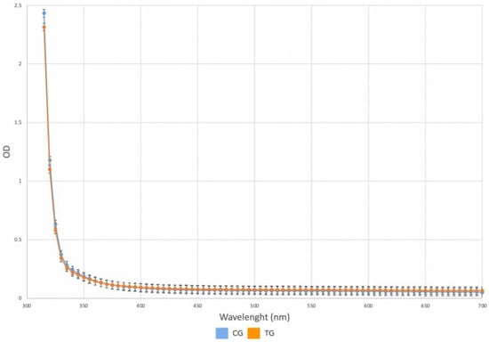 As shown in Figure 3, no significant differences in the optical density of the TG samples could be detected as the absorbance spectra overlapped. According to the Beer–Lambert law, light attenuation depends on the properties of the material through which the light is passing: