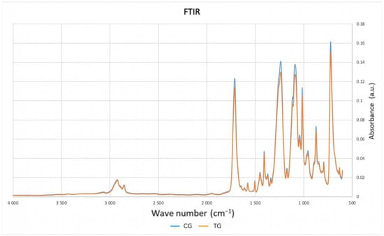 Average FTIR spectroscopy spectrum of the CG (blue) and TG (orange) samples.