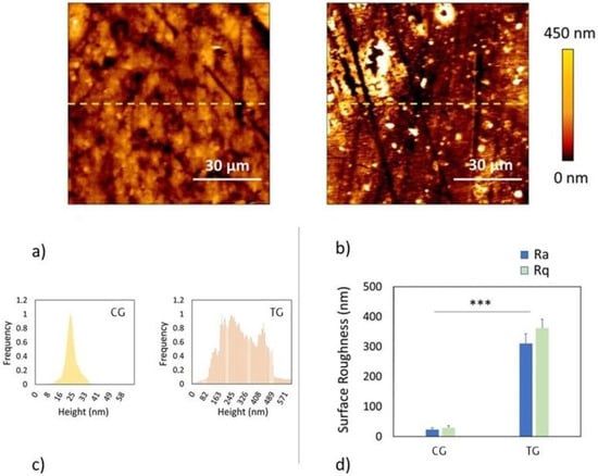 (a) Representative surface of the CG sample made with the atomic force microscope; (b) representative surface of the TG sample made with the atomic force microscope; (c) histogram chart of the profile heights on the surface of a CG sample and a TG sample. “Frequency” refers to how often a given value was observed. The curve is normalized to 1, meaning that the most frequent value is assigned a value of 1 and all other values are proportional; (d) quantification of CG and TG roughness based on roughness average (Ra) and RMS roughness (Rq). * p < 0.01; ** p < 0.001; *** p < 0.0001.