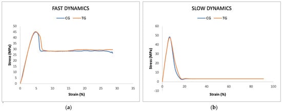 (a) Fast dynamics: representative stress–strain curve (8 mm/s) of the CG (blue) and TG (orange) samples; (b) slow dynamics: representative stress–strain curve (0.8 mm/s) of the CG (blue) and TG (orange) samples.