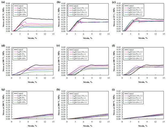 Stress-strain curves of bioPUR foam composites with LigW, LigW/LG ratio 1/1, and LigW/LG ratio 1/2 particles at (a–c) 23 °C, (d–f) 100 °C, and (g–i) 200 °C.