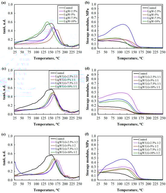 DMA curves of bioPUR foam composites with LigW, LigW/LG ratio 1/1, and LigW/LG ratio 1/2 particles: (a,c,e) tanδ and (b,d,f) storage modulus.
