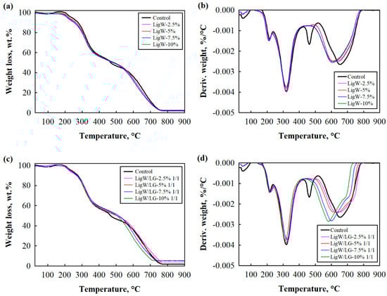 The thermal resistance of bioPUR foam composites was evaluated by the TGA and DTG methods (Figure 3, Table 3). The shape of the curves remained unchanged with LigW or LG-modified LigW particle loading.