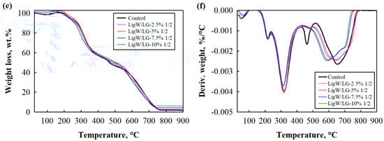 Thermal degradation patterns of bioPUR foam composites: (a) TGA of bioPUR with LigW, (b) DTG of bioPUR with LigW, (c) TGA of bioPUR with LigW/LG ratio 1/1 particles, (d) DTG of bioPUR with LigW/LG ratio 1/1 particles, (e) TGA of bioPUR with LigW/LG ratio 1/2 particles, and (f) DTG of bioPUR with LigW/LG ratio 1/2 particles.