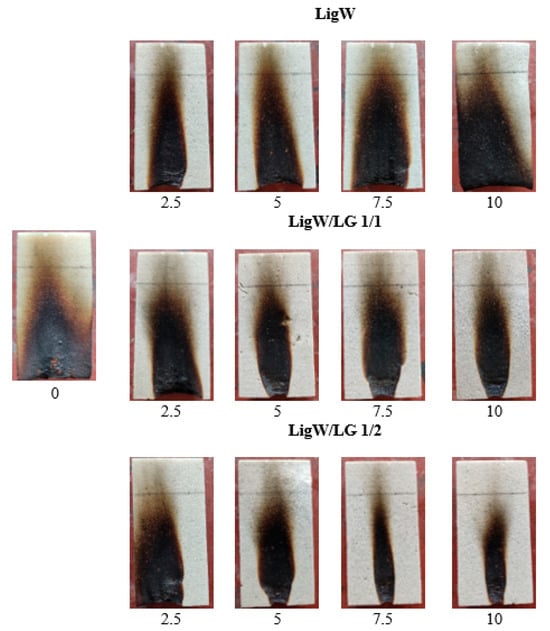 Small-scale ignitability tests were implemented to determine the flame spread behaviour in unmodified and LG-modified LigW bioPUR foam composite systems. Figure 4 presents images of the burnt samples after the ignitability test. Additionally, Table 4 shows the main parameters obtained during the test.