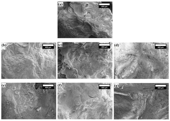 Microstructure of char residues of bioPUR foam composites after cone calorimetry (magnification ×100): (a) control, (b) LigW—5 wt.%, (c) LigW—10 wt.%, (d) 5 wt.% of LigW/LG ratio 1/1, (e) 10 wt.% of LigW/LG ratio 1/1, (f) 5 wt.% of LigW/LG ratio ½, and (g) 10 wt.% of LigW/LG ratio 1/2.