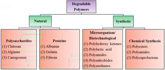 Biodegradable polymers are those that occur in nature such as polysaccharides, proteins, nucleic acids (in plants/animals), those synthesized by bacteria such as polyhydroxyalkanoates, or some semisynthetic materials derived from biopolymers or purely synthetic ones such as polylactic acid, polycaprolactones, etc., (Figure 1). Synthetic degradable polymers often belong to the polyester family, such as polyglycolides and polylactides. However, such polymers are poorly biocompatible, releasing acidic degradation products. Their poor processability and loss of mechanical properties during the initial stages of degradation also limit their usefulness as biomaterials [12,13,14].