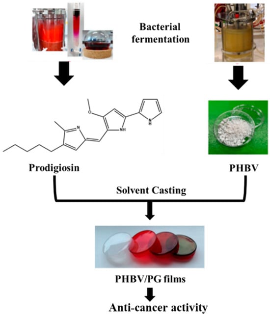 In a very recent study, a bacterial polyester PHBV and bacterial pigment Prodigiosin (PG) were produced using a simple solvent casting method [46], as illustrated in Figure 4.