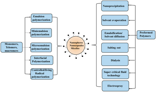 Block and graft copolymers of polylactic acid with a hydrophilic polymeric moiety behave like amphiphiles and thus self-assemble in an aqueous solution to form polymer micelles or polymersomes. These core–shell aggregates from amphiphilic polymers are excellent for solubilization of hydrophobic drugs [85,86,87]. In particular, PLA copolymers, such as those with polyglycolic acid and polyethylene glycol, have been very interesting as these can improve the characteristic properties of nanoparticles and fine-tune their applications. This co-amphiphilic entity may be water soluble if the lactic acid mole ratio is low. The form nanoaggregates and the hydrophobic drug is solubilized in the polylactic acid core that is stabilized by covalently bonded PEG shell [88,89,90,91,92]. The chemical nature adjustment by the proper ratio of comonomer results in interesting physical/chemical/biological properties in the NPs which would be desirable for their biomedical applications. Several studies have reported the NPs of polylactic acid-polyglycolic acid copolymers using varying ratios of lactic acid and glycolic acid to achieve improved results [93,94,95,96,97,98,99,100,101,102]. PLA graft copolymers also form multiphase polymer systems with an enormous possibility of improving the desirable features of polylactic acid in biomedical applications. The PLA-based graft copolymers are categorized on the basis of different monomers/polymers attached to PLA. That can be prepared using different grafting strategies. These PLA-based graft copolymers with biomacromolecules such as chitosan, cellulose, dextran, starch, etc., as well as synthetic polymers like polyethylene glycol, and vinyl-based polymers have been reported in the literature [103,104,105,106,107,108,109].