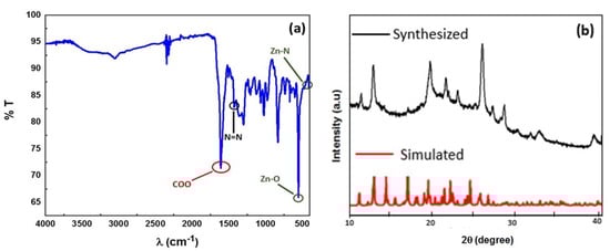 FTIR spectrum (a) and XRD result (b) of the ZnMOF structure.