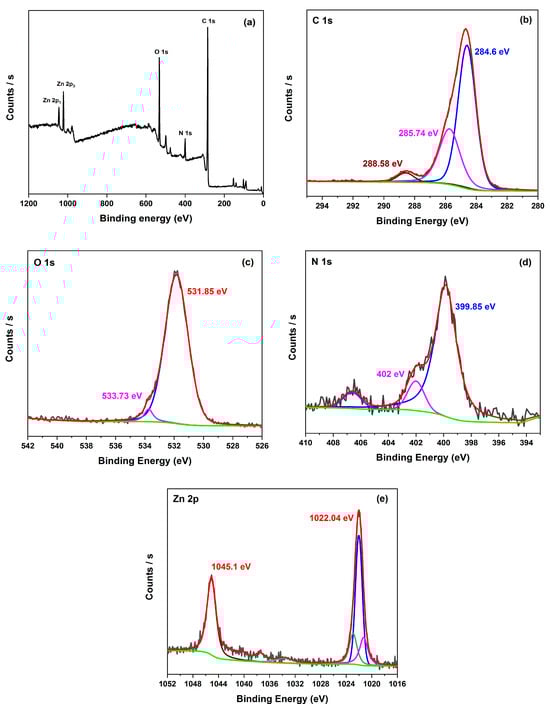 XPS spectra of (a) the survey spectrum, (b) C 1s, (c) O 1s, (d) N 1s, and (e) Zn 2p of ZnMOF.