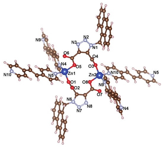 Enhancement of the adsorption and separation capabilities of materials can be achieved by altering metal sites and organic ligands [,,]. At the same time, different chemical components impart significant semiconductor behavior to the framework structure [,]. The coordination number of metal ions is very effective in the formation of the crystal structure of the molecule. As an example, Zn(II) d10 is a closed shell metal ion, with three coordination numbers that can take [], and are suitable for, the construction of various coordination architectures []. The energy consumption associated with the transition of the hydrated ion between the three different coordination numbers is around 0.4 kcal mol−1 when considered in the gas phase. The ability of Zn(II) to act as a catalytic center is enhanced by its propensity to readily engage in the coordination–decoordination equilibrium, which is contingent upon the prevailing environmental conditions []. The zinc ion exhibits the ability to tolerate various structural arrangements, including linear or zigzag chains, ladder configurations, a square, a rhombus, brick wall constructions, and diamond meshes owing to its versatile coordination environment and geometries [].