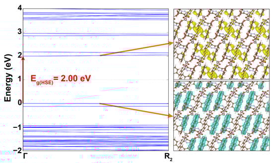 The computational methodology employed in this study involves density functional theory (DFT) [,] calculations implemented within the Vienna Ab initio Simulation Package (VASP) [,,,]. The potentials for all constituent elements of the MOF molecule were described using the projector augmented wave (PAW) method [,]. The exchange-correlation potential was approximated using the Perdew, Burke, and Ernzerhof (PBE) functional within the generalized gradient approximation (GGA) []. To correct the underestimated electronic band gaps resulting from the GGA-PBE, the Heyd–Scuseria–Ernzerhof (HSE06) hybrid functional was employed [,]. The HSE06 functional incorporated 25% nonlocal Fock exchange, 75% PBE exchange, and 100% PBE correlation energy. A plane-wave basis set with an energy cutoff of 500 eV was used for the calculations. The Brillouin Zone (BZ) was sampled using a Γ-centered 5 × 5 × 5 uniform k-point mesh generated through the Monkhorst–Pack scheme []. Periodic boundary conditions were applied along the x, y, and z axes. The atomic positions were optimized using the conjugate gradient method until the forces on each atom converged to less than 0.01 eV/Å. The convergence criteria for the electronic and ionic steps were set to 10−6 eV and 10−5 eV, respectively. A Gaussian smearing factor of 0.05 eV was utilized. To explore the optical response of the MOF, the frequency-dependent imaginary dielectric function (ε2(ω)) was examined using the independent-particle approximation (IPA) []. The Kramers–Kronig transformation was applied with a complex shift of 0.01, and the total number of bands was increased to 560.