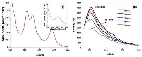 The absorption coefficient of ZnMOF as a function of wavelength obtained from a complex dielectric function (ε2(ω)) (a). Emission spectrum of ZnMOF excited at different wavelengths (b).