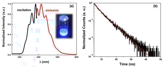 Fluorescence excitation (εabs 413 nm) and emission (εexc 366 nm) spectra of ZnMOF in ethanol at room temperature (a). The time-resolved emission decay curves of ZnMOF at a wavelength of 413 nm were measured under normal circumstances. The red line represents the fitting curves, while the black line represents the experimental data (b).