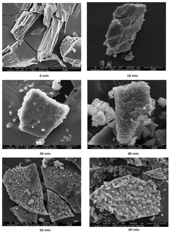 SEM images of ZnMOF formation from initial irradiation to 60 min of irradiation.