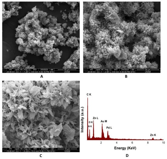 SEM images (A–C) and EDAX spectrum (D) of ZnMOF at the final stage (70 min).