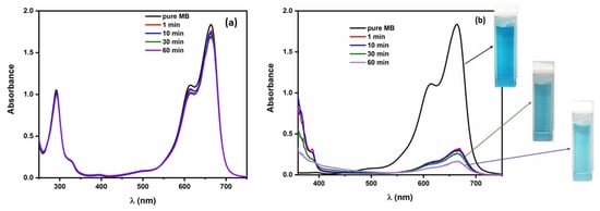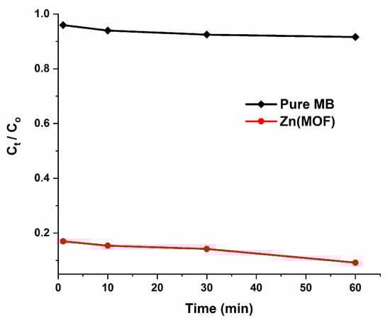 A study was performed to determine the photocatalytic performance of ZnMOF, which was employed for the photodegradation of MB dye by exposing it to UV light and then using spectrophotometric monitoring to determine how much of the dye was broken down. The absorption spectra of pure MB without ZnMOF and MB in the presence of ZnMOF is recorded as a function of irradiation time, as shown in Figure 12. The observation reveals a rapid reduction in the intensity of the typical peak at 664 nm as the irradiation period progresses. The spectral bands detected within the visible range at wavelengths of 664 and 612 nm are indicative of the presence of chromophore groups inside the MB molecules, which can be attributed to the sulfur–nitrogen-conjugated system [,]. Consequently, the hue of the MB solution progressively diminished. Approximately 83% of the degradation of MB occurred within a 1 min period of irradiation in the solution containing ZnMOF. When the irradiation was extended to 60 min, a minimal alteration was detected.
