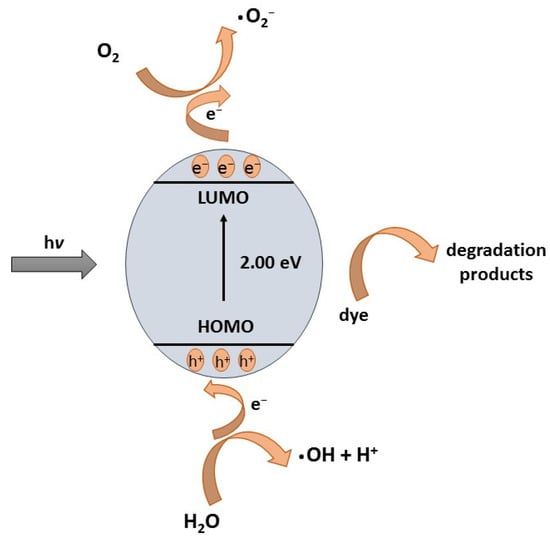 Typically, the electron of the excited state in the LUMO is readily lost, whereas the HOMO requires one electron to return to its stable state. Therefore, one electron is captured from the water molecules, and the .OH active species is oxygenated. The .OH radicals can then efficiently decompose MB to conclude the photocatalytic process. To comprehend the photocatalysis mechanisms of MOFs, the discrete nature of the light-induced transitions in MOFs should be described using the terminology of the HOMO–LUMO gap rather than the traditional semiconductor gap (CB-VB) (Figure 14) [,].