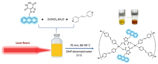 ZnMOF structures (classified as ZnMOF2 in reference []) were synthesized previously by Biswas et al. using a well-known solvothermal method at 110 °C in 1 day. Additionally, in the literature, a laser ablation technique using metallic zinc and a single organic ligand [] was found for the preparation of MOF structures. One needs to clearly state that the laser-driven approach that we used is different than the ablation method, the metal source was used in ionic form, and the MOF was synthesized by combining two organic binders via laser. In this study, 1-(Anthracene-9-methyl)-1H-1,2,3-triazole-4,5-dicarboxylic acid (H2L) and 1,2-bis(4-pyridyl)ethene (bpe) were added to a [DMF/H2O] mixture, and then a laser-driven method with a laser beam with a wavelength of 975 nm was used for the synthesis of ZnMOF, forming a flowery image during 70 min of irradiation, as shown in Scheme 1.