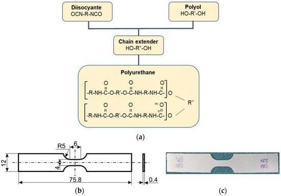 The material used in this research is a thermoplastic polyurethane shape memory polymer manufactured by SMP Technologies Inc., Tokyo, Japan, characterized by a glass transition temperature of approximately 65 °C and denoted by the producer as MM6520. The basic synthesis process of this material is shown in Figure 1a [,]. The shape and dimensions of the PU-SMP specimen designed after numerous trials and discussions for the experimental investigation of mechanical and thermomechanical properties are presented in Figure 1b, while its photograph is in Figure 1c, respectively.