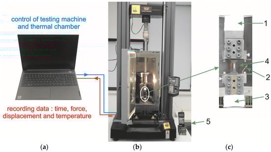 Schematic diagram of the used testing setup: (a) computer, (b) testing machine with the thermal chamber, (c) specimen in the grips of the testing machine showing thermocouples 1—on the upper grip, 2—in specimen area, 3—on the lower grip, 4—specimen, 5—temperature indicator.