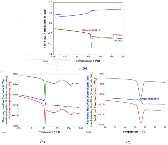 Another approach that enables determining the glass transition temperature from the first heating of the DSC experiment is to use modulated differential scanning calorimetry. The obtained MDSC results for the PU-SMP in a temperature range from −50 °C to 200 °C are shown in Figure 3b, while the use of a smaller temperature range for better visualization from 20 °C to 80 °C is shown in Figure 3c. It shows the crystallization that is followed by melting on the non-reversible heat flow curve. The reversing heat flow signal shows a glass transition near 56.2 °C. The Tg shifts to a lower temperature compared to the conventional DSC experiment due to the lower heating rate used in the MDSC technique (3 °C/min).