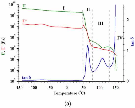 The storage modulus E′, loss modulus E″ and loss factor tan δ as a function of temperature obtained during DMA experiments conducted for the PU-SMP are presented in Figure 4. The behavior of the polymer changes with the temperature according to its molecular mobility. Considering the modulus behavior, four distinct regions in the diagram can be identified: the glassy region (I), the glass transition (II), the rubbery (III) and the flowing (IV) regions (Figure 4a). The drop in the E′ curve and the peak in the tan δ curve provide information about the glass transition temperature (Tg) and the polymer behaviors at various temperatures (Figure 4, Table 1).