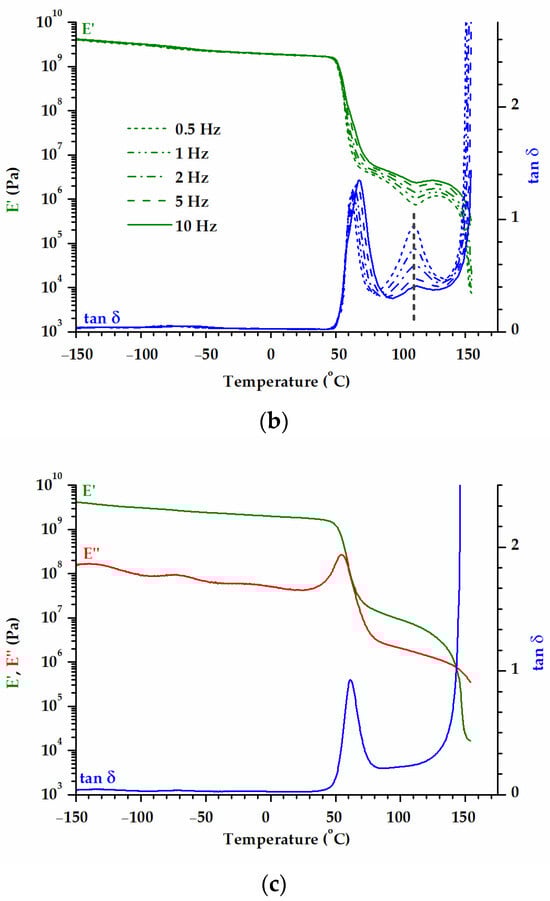 Secondary relaxations have been observed for the PU-SMP in the negative temperature range. The glass transition is followed by a phenomenon that is frequency independent; considering the E′ trend in that region (100–150 °C, Figure 4b,c)—decreasing followed by increasing—it is very probable to have a succession of overlapping melting/crystallization phenomena. These phenomena are emphasized by the DSC (Figure 3).