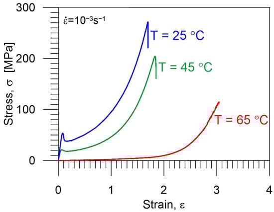 A comparison of the average results, i.e., stress–strain curves at 25 °C, 45 °C and 65 °C, is depicted in Figure 5. In the case of 65 °C, conducting the tension until rupture was not possible due to thermal chamber limitations. Namely, any of the three specimens were ruptured within circa 6 h during the experiment duration and the tests were automatically stopped by the preset displacement limits of the Instron testing machine system.