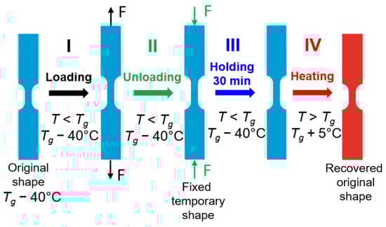 During step I, the specimen is mounted in the grips of the testing machine and deformed by tension at room temperature (25 °C) with a strain rate of 10−3 s−1 to a particular strain value beyond the yield limit (60%). In step II, the specimen is unloaded with the same strain rate to the zero-force value, which is accompanied by a small strain recovery, so-called “spring back”, which is a characteristic phenomenon for polymers. During step III, the specimen is held in this state for 30 min. The PU-SMP contraction occurs which is a result of the viscoelastic recovery of SMP under isothermal conditions. This phenomenon refers to PU-SMP structural relaxation which allows the material to stabilize its state []. Then, in step IV, the specimen is heated from Troom to Tg + 5 °C = 70 °C with a rate of 12 °C/min under no-load conditions, leading to the recovery of the PU-SMP’s original shape.