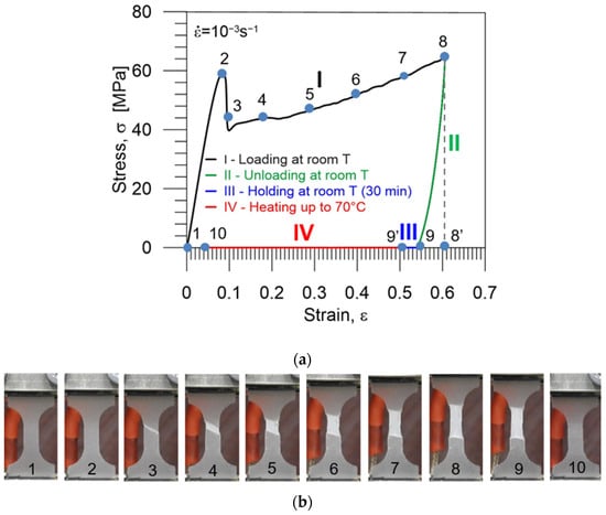 (a) Stress vs. strain curve obtained during the PU-SMP thermomechanical loading cycle at a loading temperature of 25 °C. Particular colors mark subsequent stages of the program: I (black)—loading at room temperature (25 °C), II (green)—unloading to zero stress at room temperature, III (blue)—holding at room temperature during 30 min (structural relaxation), IV (red)—heating up to 70 °C. Numbers 1–10 correspond to the strain values in thermomechanical loading cycle for which the photographs below were taken, while 8′ and 9′ denote the maximum strain value εm and the strain after holding at room temperature εh, respectively; (b) photographs showing subsequent stages of specimen deformation: 1—before loading, 2–8—during loading, 9—after unloading (shape fixity), 10—after heating to 70 °C (shape recovery).