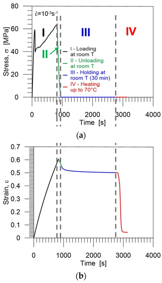 An example of the experimental results, obtained during the cycle of thermomechanical loading in a cold programming approach at room temperature, i.e., the stress vs. strain, is presented in Figure 7a. Selected colors used in the diagrams indicate each stage of the program: I (black)—loading at room temperature (25 °C), II (green)—unloading to zero stress at room temperature, III (blue)—holding at room temperature during 30 min (structural relaxation), IV (red)—heating up to 70 °C.