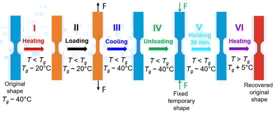The shape memory properties of PU-SMPs were investigated using a thermomechanical loading program in the cold programming approach, in which the deformation of the SMPs into the programmed shape was conducted at temperatures below Tg. In addition, the shape fixity and shape recovery values were determined through a traditional hot programming cycle conducted at the Tg of the PU-SMP. More experimental details are presented in Section 3.3, since the detailed procedure presented just before the experimental results will help readers properly understand this rather complicated research program.