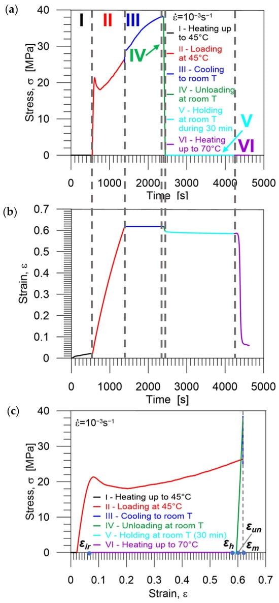 Diagrams demonstrating the procedure and showing the experimental results, obtained during the cycle of thermomechanical loading in the cold programming approach at 45 °C, i.e., the stress and strain vs. time as well as stress vs. strain curves are presented in Figure 10a, Figure 10b and Figure 10c, respectively. Selected colors used in the diagrams indicate each stage of the program: I (red)—heating up to 45 °C, II (black)—loading at 45 °C, III (blue)—cooling down to room temperature (25 °C), IV (green)—unloading at room temperature (25 °C) to zero stress, V (light blue)—holding at room temperature during 30 min, VI (violet)—second heating up to 70 °C. The strain values εm, εun, εh and εir essential for the estimation of shape memory properties are marked by blue points in Figure 10c.