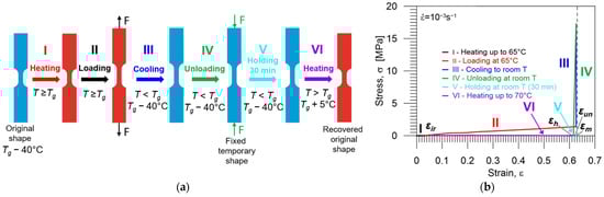 (a) Schematic demonstration of the thermomechanical loading program at 65 °C presenting the subsequent stages of thermomechanical loading (I–VI) and showing the shape and gauge length changes in the PU-SMP specimen; (b) stress vs. strain curve obtained during the PU-SMP thermomechanical loading cycle at 65 °C. Particular colors of curves mark subsequent stages of the program: I (red)—heating up to 65 °C, II (black)—loading at 65 °C, III (blue)—cooling down to room temperature, IV (green)—unloading at room temperature to zero stress, V (light blue)—holding at room temperature during 30 min, VI (violet)—second heating up to 70 °C (Tg + 5 °C).