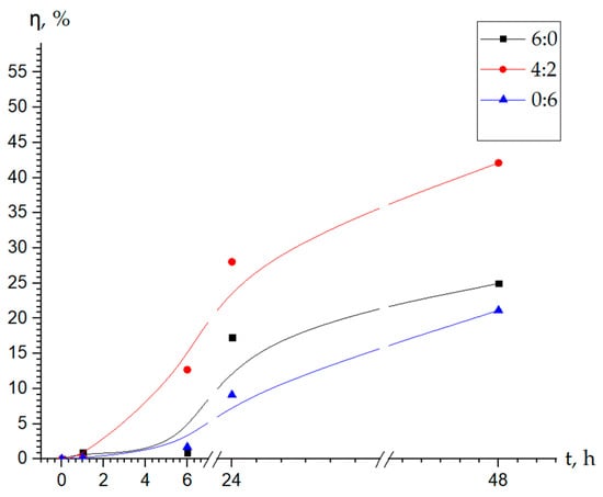 | Molar Ratio of Lewatit CNP LF@AV-17-8 (X:Y) | Mass Ratio of Lewatit CNP LF@AV-17-8 (X:Y) a | θ after 1 h | θ after 6 h | θ after 24 h | θ after 48 h |