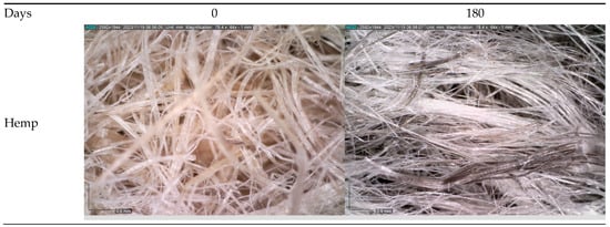 On the other hand, in the nonwoven mulch blends from jute and hemp with PLA fibers, the maintenance of the structure due to non-degraded PLA fibers is visible. The decrease in the density of nonwoven blends of jute (21.9%) and hemp (21.9%) mulches is less than that of mulches produced from 100% jute (27.0%) and hemp (36.1%) fibers. When considering the calculation of the density and the microscopic pictures of the mulches after ten months of exposure to field conditions, it can be concluded that the non-degraded PLA fibers in the jute and hemp mulch blends contribute to the maintenance of the structure.