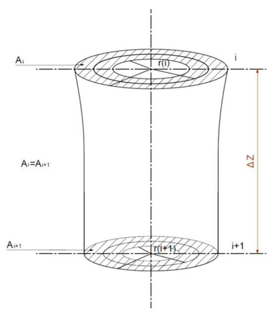 Assuming a constant cross-section area () of about Δz micro-section, we selected a value of the radius of between the outer radius and inner radius to satisfy the following equation [31]: